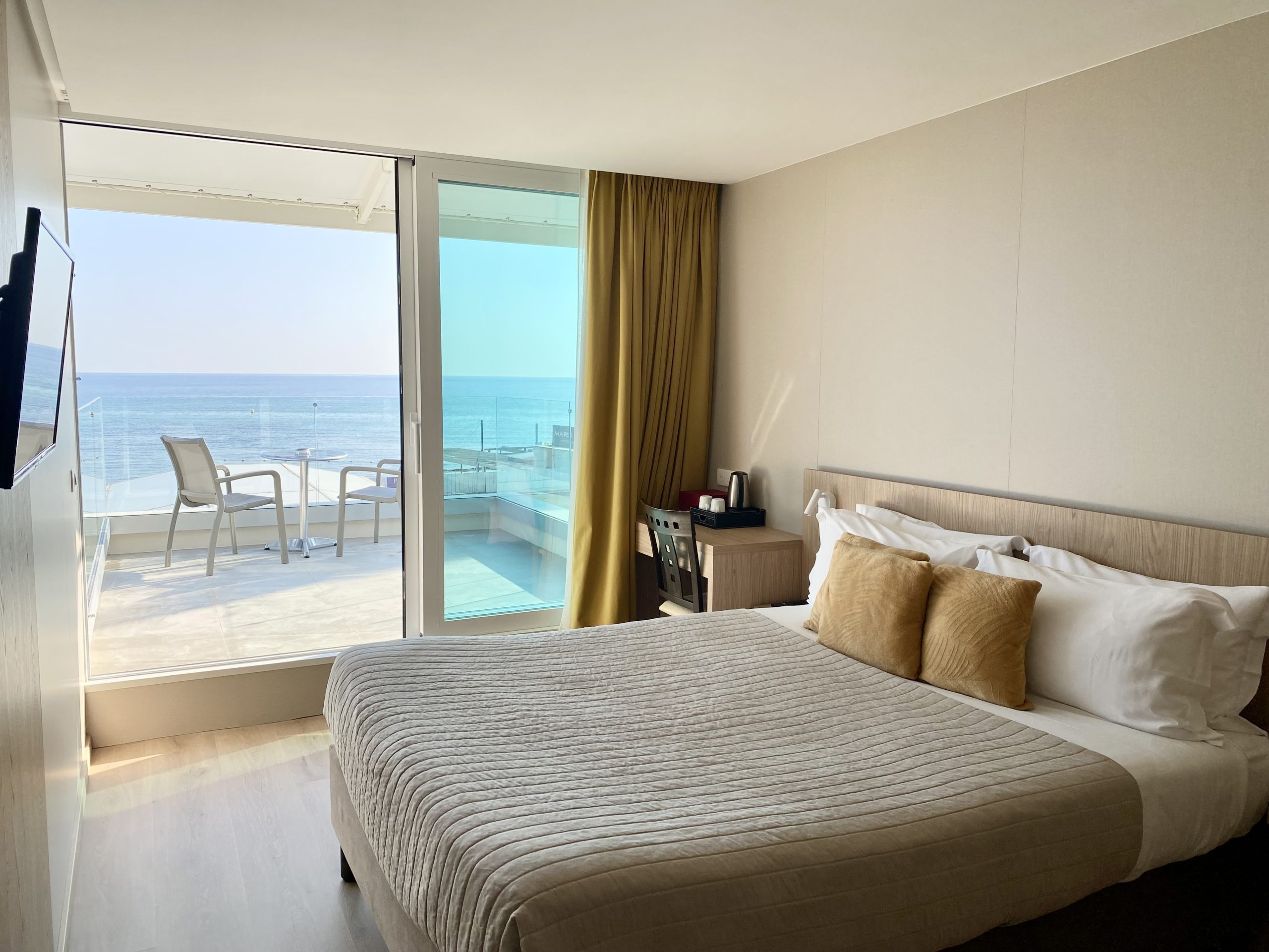 Bienvenue dans notre chambre lits jumeaux au style méditerranéen. Profitez de l’ambiance chaleureuse et colorée de cet espace accueillant, équipé de deux lits confortables. La décoration vive et lumineuse crée une atmosphère relaxante. Admirez la vue imprenable sur la mer, idéale pour savourer des moments de tranquillité. La chambre est équipée de toutes les commodités modernes pour assurer votre confort. Votre oasis méditerranéenne vous attend pour un séjour inoubliable.